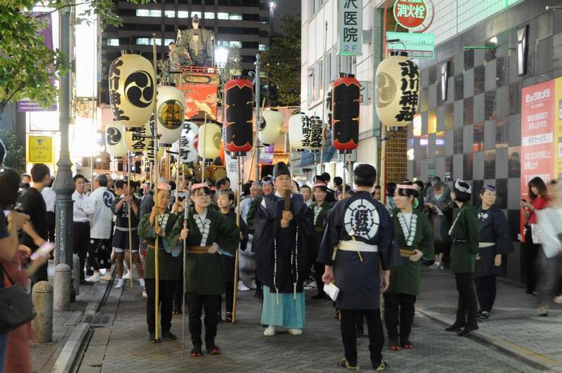 夜の赤坂駅・赤坂見付駅周辺を背景に江戸型山車「翁」と町会神輿2基が巡行した。