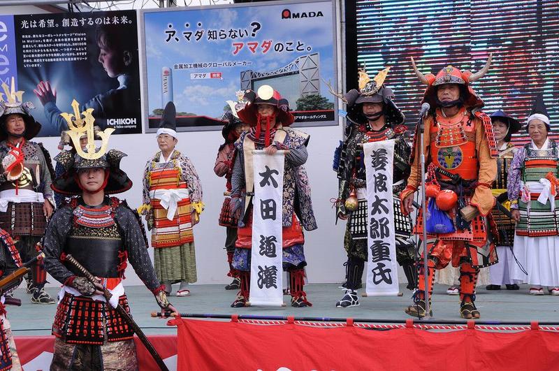 太田道灌・北条政子役の紹介式の後、いせはら甲冑隊紹介式が有り、寸劇で相模五人の武将揃踏があった。
