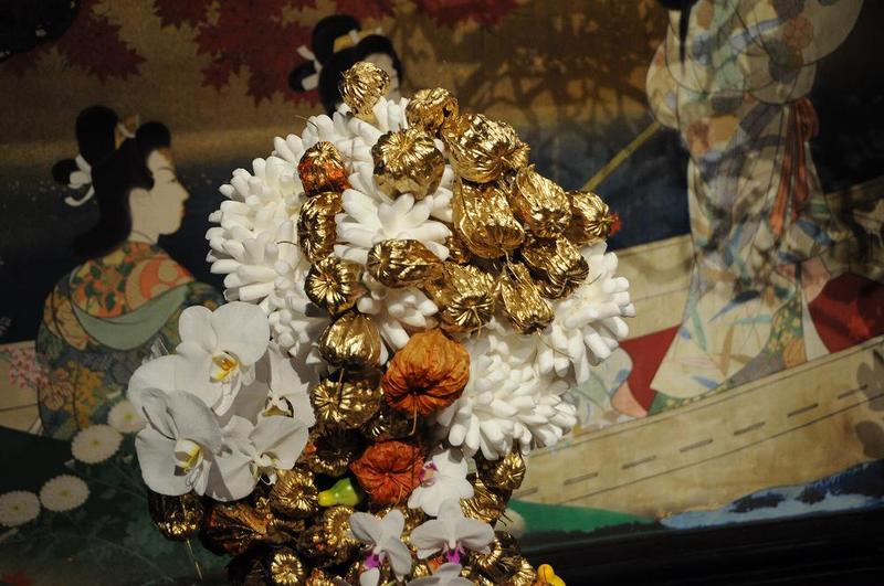 二枚目の写真は、ほおづきは着色したもの、その下に発泡スチロールで造られた様な白い塊、これも実際の花だそうだ。「一葉式いけ花」は、花や植物と自分との“間”を大切にしている。