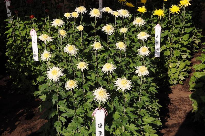 この花壇に陳列している品種は、小菊のなかでも一重咲きの山菊とよばれる品種を用いている。