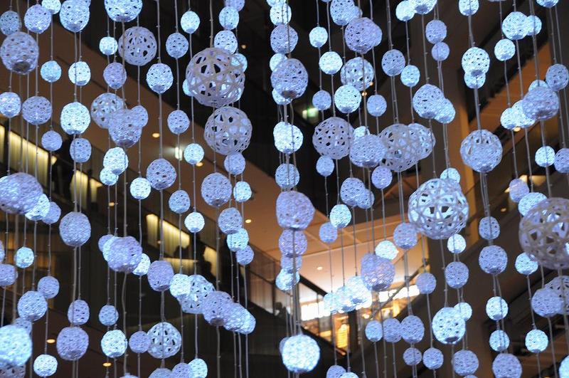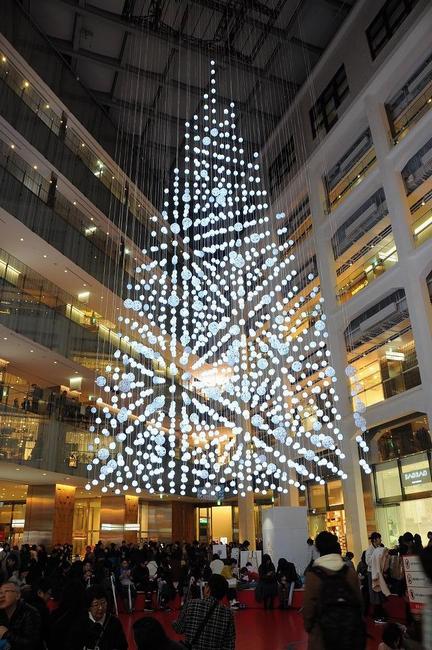 今年のKIITEビルのクリスマスツリーは、天井から吊るされたヒモに、丸い駕籠が付いている。