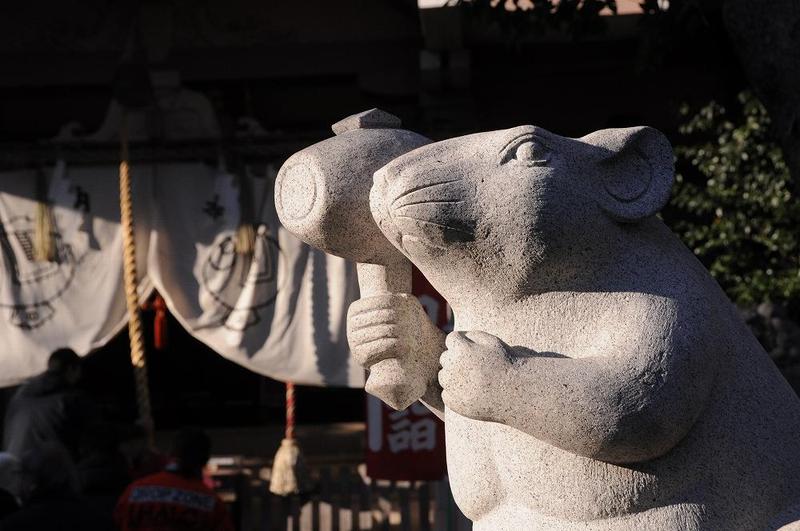 この杉山神社には、本殿前の両脇に狛犬がいて、さらに、10メートルほど前に一対の狛ネズミがいた。