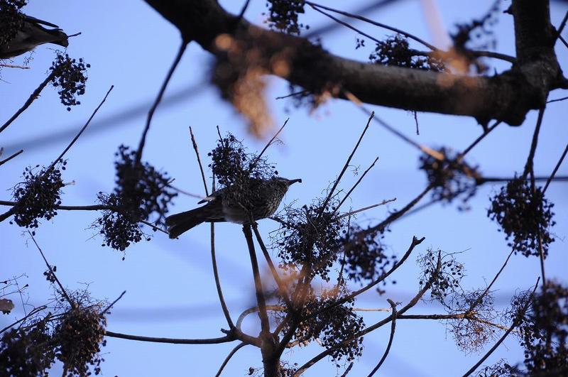 ヒヨドリのような中型の鳥が、10数羽でなにやら啄ばんでいた。