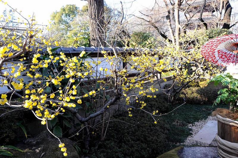 2本並んだロウバイの木、赤い毛氈を敷いた休憩場所で、借景に寛永寺の五重塔をいただき、江戸情緒を満喫していた。