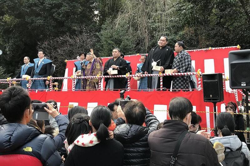 挨拶は、午後3時30分から宮司、俳優、秦野市長がして、舞台前に並んでいた豆撒きの人から、ひとりひとり子供たちに豆の袋が手渡された。
