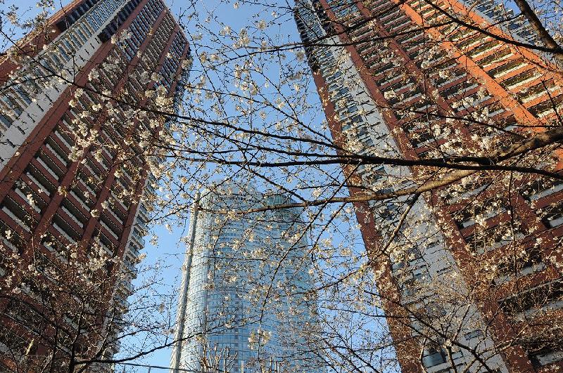 橋の上から桜並木を見渡すが、まだまだ、2〜3分咲き程度だ。 やはり、染井吉野が75本並び、約400mの桜並木となってライトアップがあるため、六本木ヒルズの夜景と組み合わせると、絵になる景色と思われる。