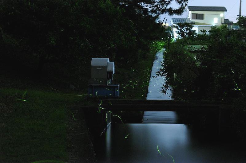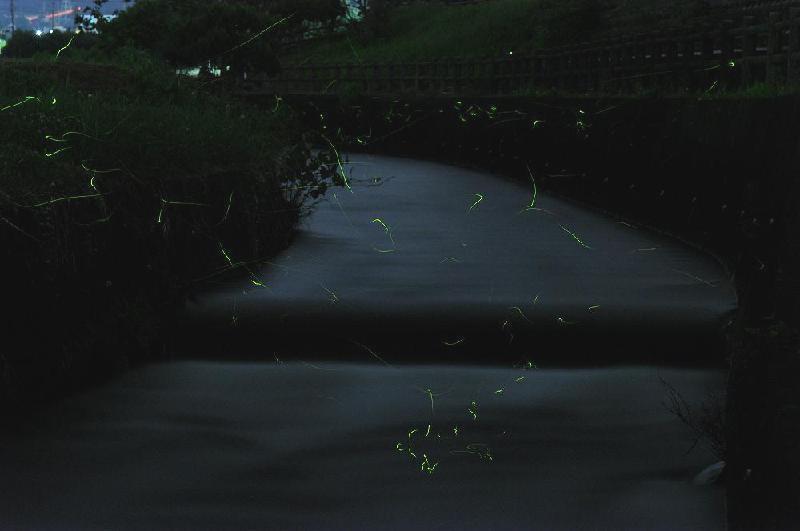用いるカメラは単焦点85ミリ(f1.4)絞りはF9でシャッタースピードは3分程度(1つの集団が水路の中ごろ35メートル付近から、手前の分水池に出てくるまで)。 カメラの焦点距離(ピント)は35メートル付近に合わせているので、水上を飛ぶホタルと水面に映るホタルの灯りが見える絶好のポイントだ。