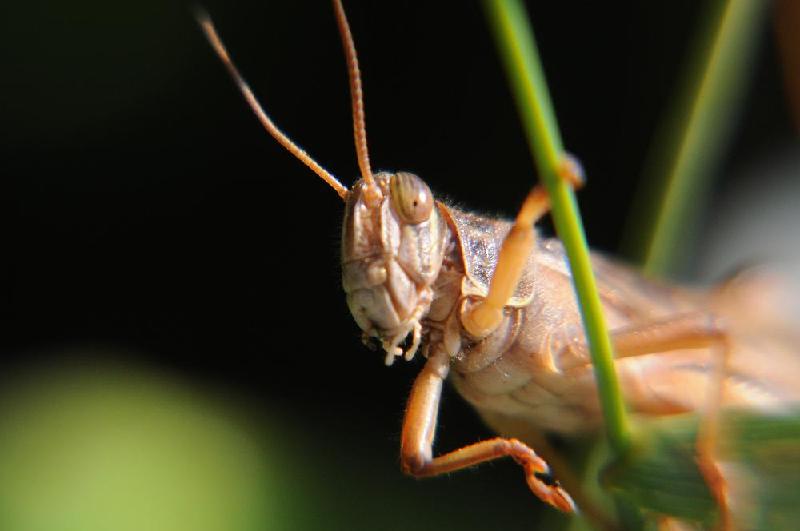 もう1匹は1センチほどで、3匹目の茶色バッタの強い顔面を恐れている様子。 |