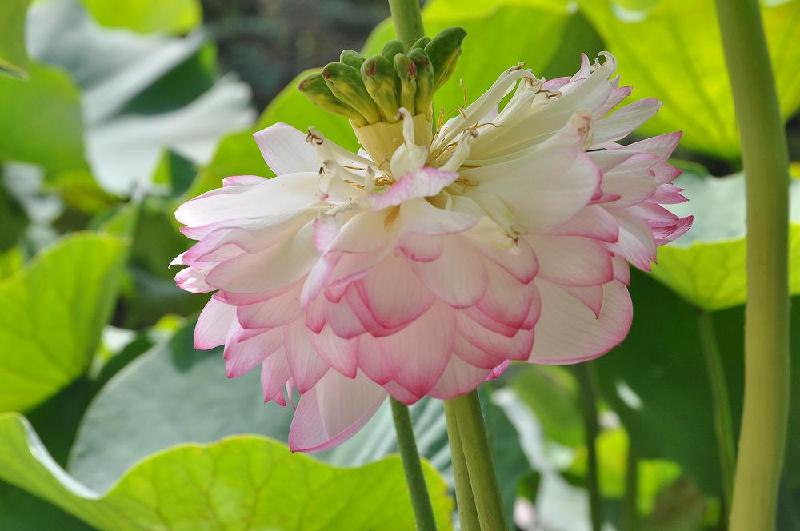 午後(13時近く)からになってしまい、ほとんどのハスの花は閉じていた。大船フラワーセンターでは、玄関前の広場に20鉢、温室前に28鉢、そして、スイレン池の奥に有るハス池100本あまりのハスがあるが、2020年1月、静岡県沼津市の本廣寺の関戸慈誠住職から約190種のハスを譲り受けた。