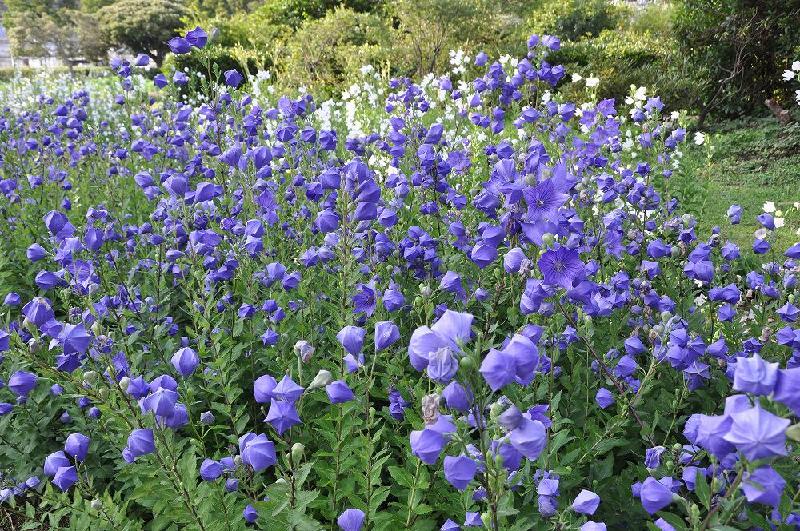 もう一つのキキョウ畑、目測10メートルだが、紫の花と白の花とピンクのキキョウの混合栽培だった。。