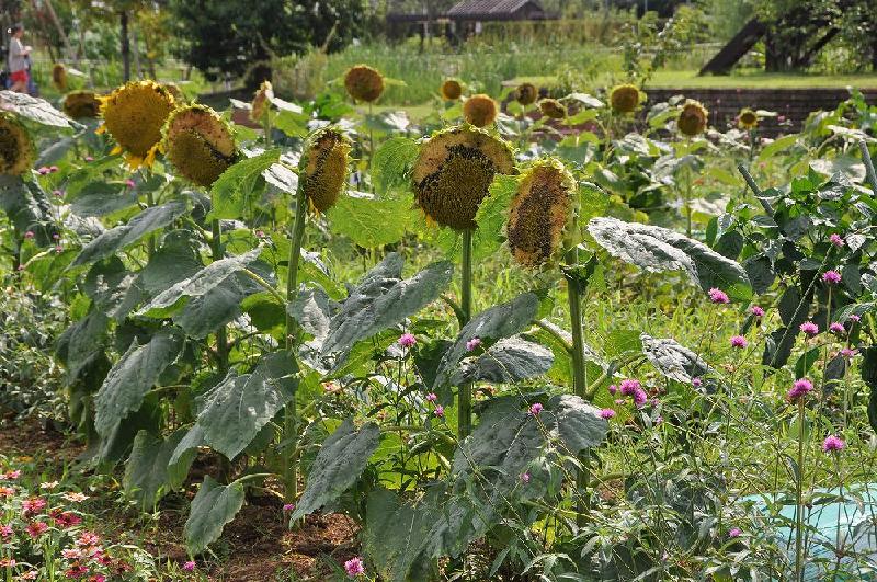 野菜畑の一角にミニひまわりが100本ほど栽培されているが、見ごろは6月〜7月だったので、いまのひまわりは7〜80センチの背丈で顔が25センチ以上、一番太陽が欲しい時に毎日が雨だったせいか、種の付きが悪く、みすぼらしい顔をしている。