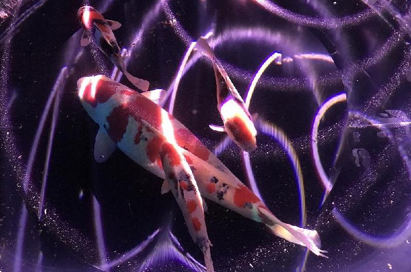 大きな円球の水槽に錦鯉が20〜30匹、さらに、大きなタライの水槽の中には、7〜80センチの巨大な鯉がいる。