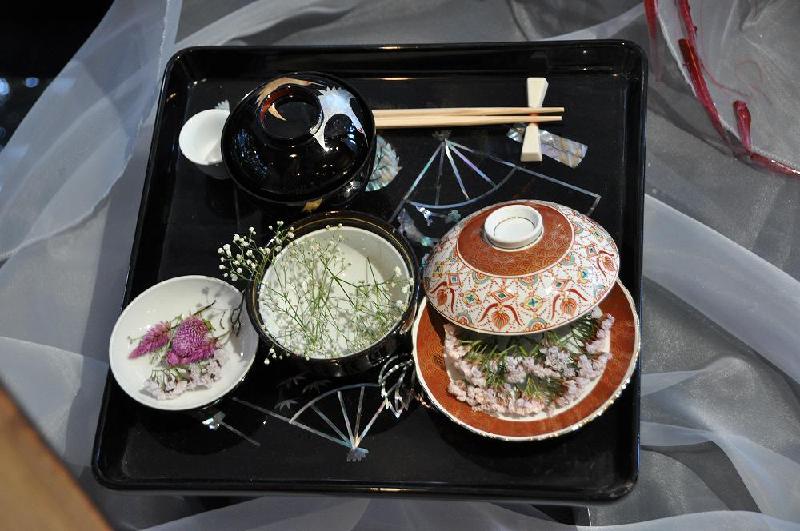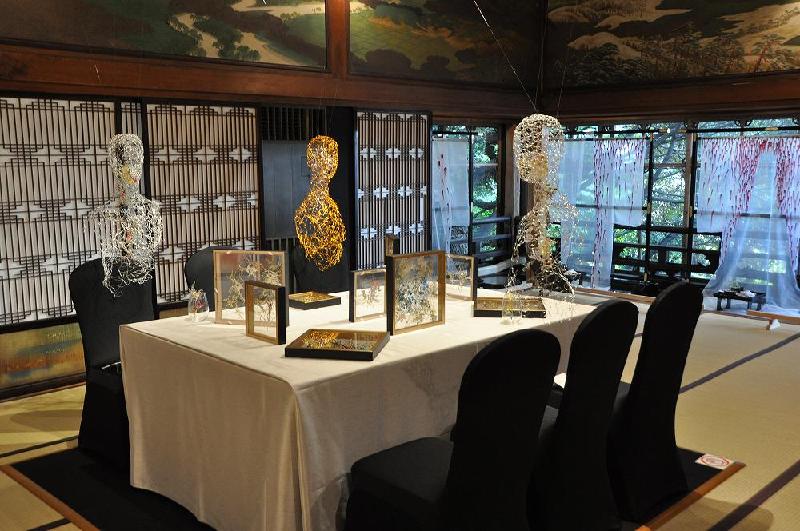 出展は立体的に作られた人型のようなものが三体、テーブルに座っているようだ。 私も製作者に勧められるまま、椅子に座って目の前の作品を写真に納めた。 漆(うるし)を何度も何度も、重ね塗りしたものだ。 窓側には肌着が掛かり、下にはお膳が・・・これもコンセプトが理解できなかった。