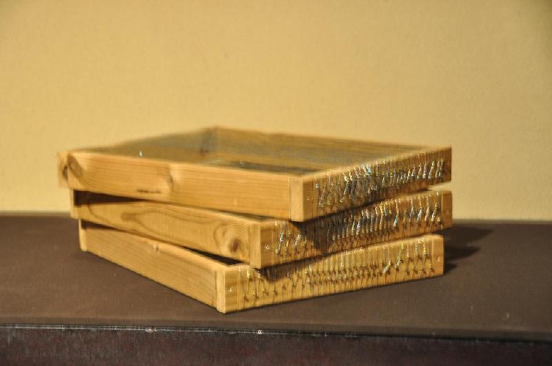 この部屋の出展物は、凡人には理解しにくいものばかりだった。 たとえば、14番目の写真で、左の上に木の枝のように伸びているのが、38万5千円で、右の黒い高さ4〜50センチの様なのが44万円の売値が付いていた。