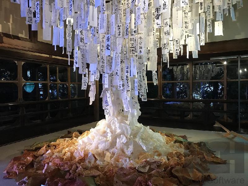 この部屋には、天井から「文字の書かれた紙」が垂れ下がり、やがて一つになり、浄化されて床に広がる。 何を表現しているのか、私には分からないが、この部屋で座って見ていると心安らぐ感じだ。