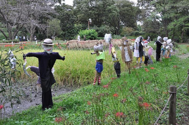 田んぼの畦のかかしは、全員で15体が1列に並んでいるが、動きは様々だ。