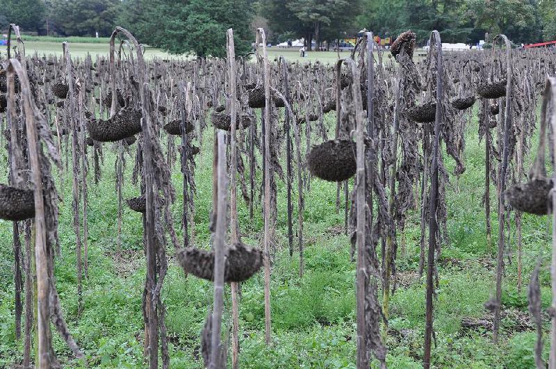 「原っぱ西花畑」では、夏に人の背ほどまで伸びたヒマワリが、刈り取られずに残っています。