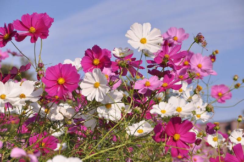 また、別の方角に植えられているコスモスは、いろいろな花と組合せて植えられていて、広場の雰囲気がガラッと変わっているようだ。