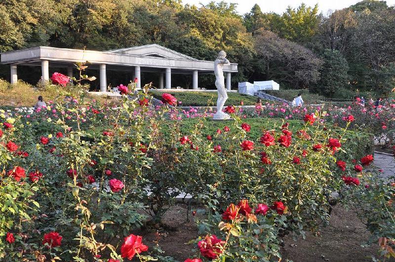 神代植物公園のバラ園は、シンメトリックに設計された沈床式庭園に植えられている。
