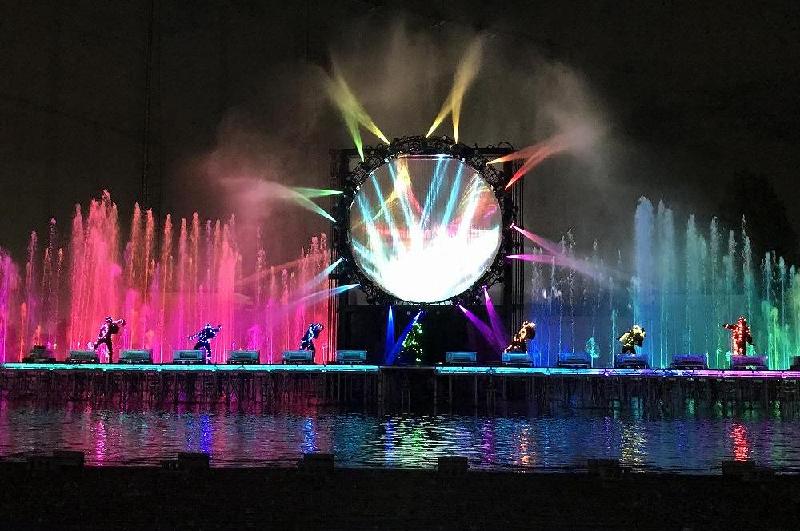 G 大迫力噴水ショーのラ・フォンテーヌ (60m幅に、噴水231本と巨大リングで、中央にはプロジェクションマッピング)