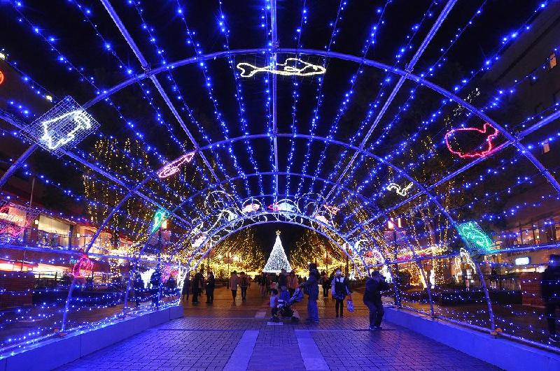 それに続く電飾飾りは、カマボコ型の壁には魚を模したイルミネーションが続き、次は街路樹にワイングラスに見せた飾り付け、その木の下には動物を模した電飾で、そして、交差点で、大きなクリスマスツリーがあって、ここから3方向にイルミネーションは分かれる。