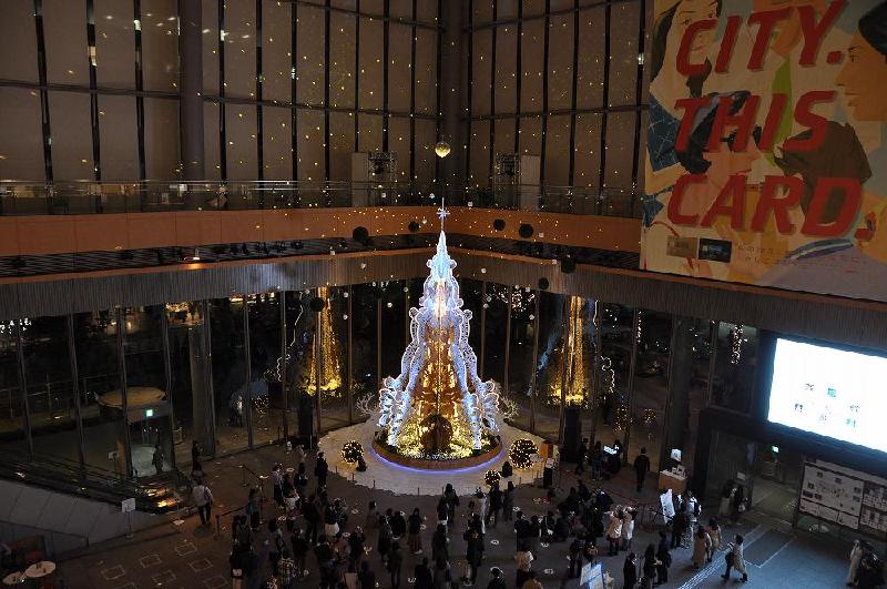 「丸ビル」のクリスマスツリーは一階から四階まで吹き抜けになっており、ミラーボールを使って雪が降るような映像で観衆をうっとりさせている。一方「KITTE」ビルは、天井まで吹き抜けで、一つひとつ職人の手によって編まれた日本の伝統工芸“水引”のツリーに、ソーシャルディスタンスを保ちながら非接触で光のアクションを楽しむことができる仕組みをプラスした「Interactive