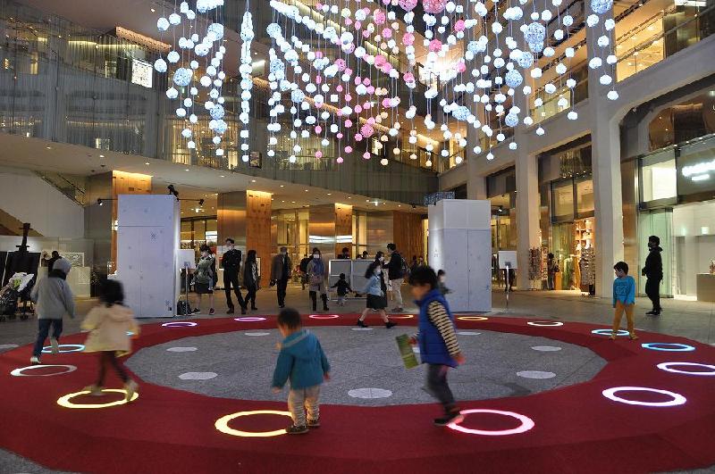 ツリーの下に約1.5メートル間隔で配置された16個のサークルを足で踏むと、頭の上のツリーのイルミネーションが連動して光り、華やかに空間を彩る。