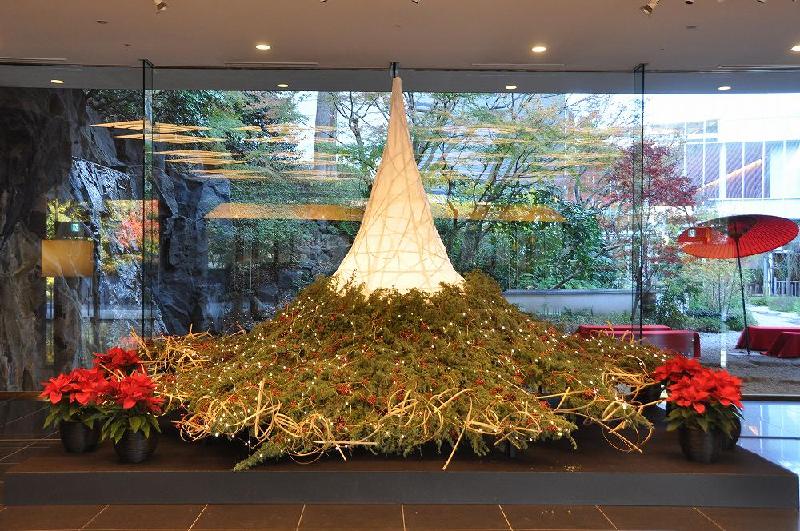 ちなみに新館の渡り橋の飾り物も一階ロビーの「クリスマスツリーのとんがり帽子」に似ていた。3階エレベーター前の飾りは、斜めにストライプが入った洒落た着物風だった。 |
