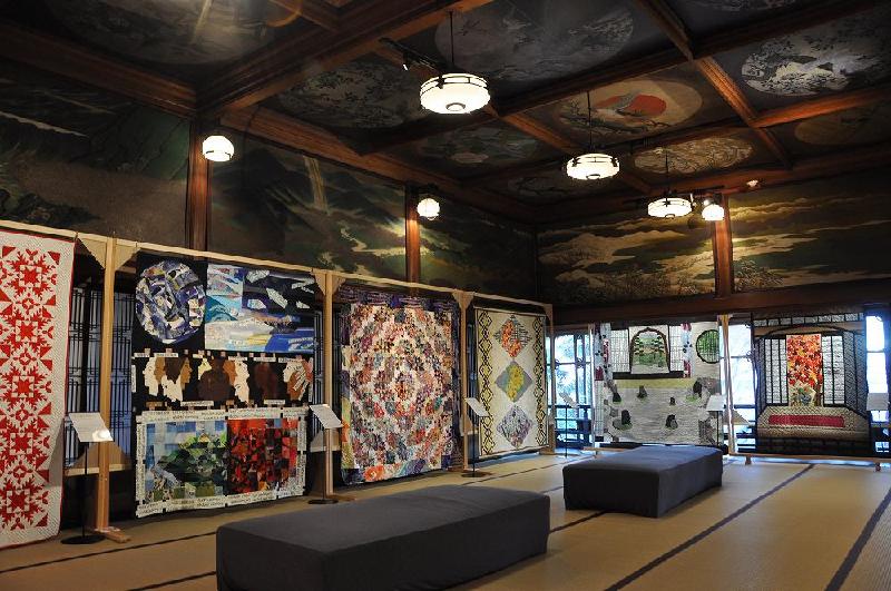 日本の伝統文化や風土と融合して誕生した「和キルト」は、パッチワークキルトの手法に、着物や縮緬、古布などの和布を用いたり、風物、色彩、文様さまざまな日本の美を表現した作品を指し、今では日本国内だけでなく海外でも広く認識され高い評価を受けている。草丘の間の近くの百段階段に、反物幅の作品も展示してあった。 |