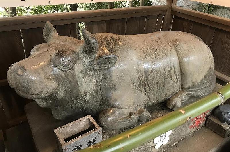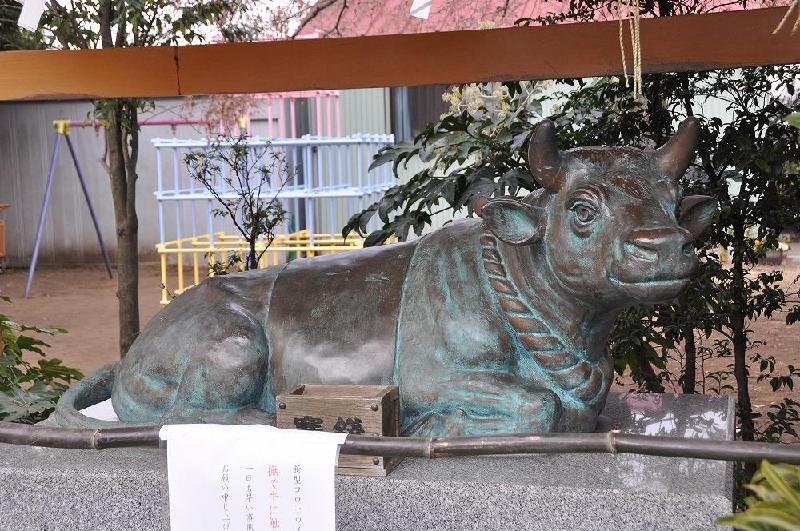 平成14年の奉納された銅製の牛像は、境内にいた。