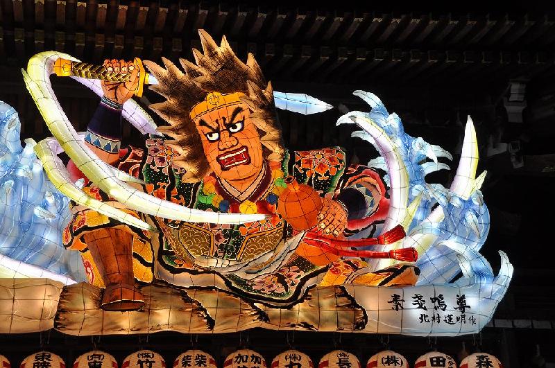 令和三年のねぶたは、新型コロナウイルス感染症の終息の兆しがみえない現状を鑑みて、災厄を払い、疫病を除き、福を招く神と言われるスサノオノミコトによって、疫病と邪気を退散していただき、当神社における授与品「大祓守」をモチーフに、茅の輪により災厄を免れ、人々の罪や穢(けがれ)を