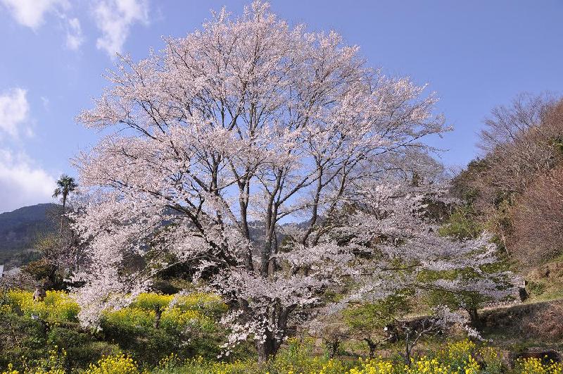 「里山の一本桜」の知名度も上がり、オーナーの猪俣さんの粋な計らいで、「桜の見頃に合わせて菜の花も一緒に楽しめるように」と、菜の花の黄色と桜の白と空の青さのコントラストが見事な景色をかもし出している。今年は異常気象で、昨年より10日ほど早く咲き、3月20日頃より見頃となった。