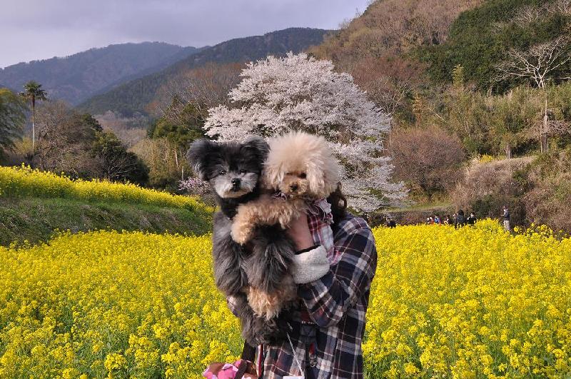 「オス犬とメス犬」の2頭は、菜の花畑の真ん中のビール瓶の空ケースの上に置かれた。