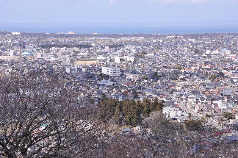 天守台から西側を臨むと、眼下には村上市の中心部と目を遠くに向けると佐渡島と日本海が見える。