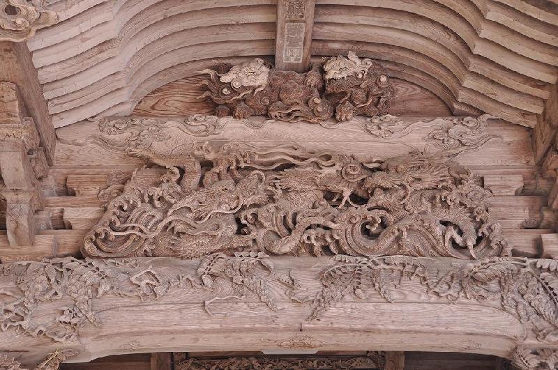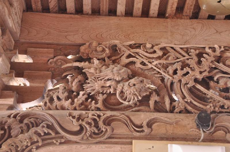 拝殿扉の扁額には内藤家裏家紋の「軍配団扇」を、拝殿内の釘かくしには内藤家の印「卍」が打たれている。また、境内の石垣は村上城の石垣と同じ柏尾の石が使われている。私の趣味で、神社やお寺で「向拝(こうはい)を飾る彫刻」に魅せられ、全国の神社仏閣を訪ねたことがあり、2000から4000ヶ所は回ったことがあり、この藤基神社を建立した「有磯周斎」氏の率いる集団がいたことを知り大収穫である。 特に、拝殿の向拝の彫物を裏側からの龍の顔の彫物は籠彫りの最たるものである。 |