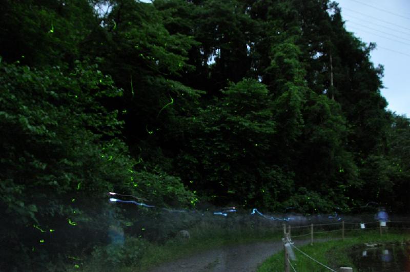 そこから上流は人家があるため、ホタルの光はチラホラ、右手に小川が流れ、小川の上は木々が生い茂り暗闇を作っている。 この辺りからホタルの数は多くなり、坂道下から2〜300メートル歩いたところで急に空まで抜けた場所があり、突如ホタルの数は多くなった。