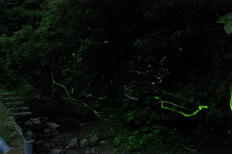 よって、滝の下の水溜りにいるホタルの飛翔を写真に収めた。 |