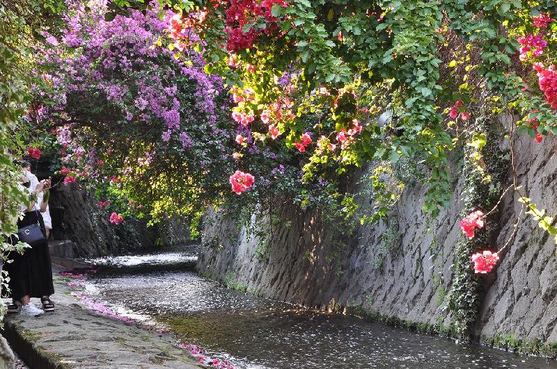 糸川の御成橋から糸川橋までの約180メートル区間に、鉢植えされたオシロイバナの低木で、川を覆うように植栽されている。