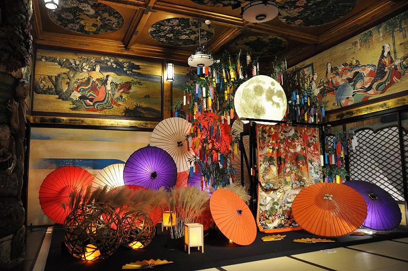 初秋のバージョンとは、着物の上に満月のお月様が出ており、床の間に近い方にはススキの穂が並べられていた。 まさに、かぐや姫が満月の夜、月に帰るストーリーを感じさせるものだった。