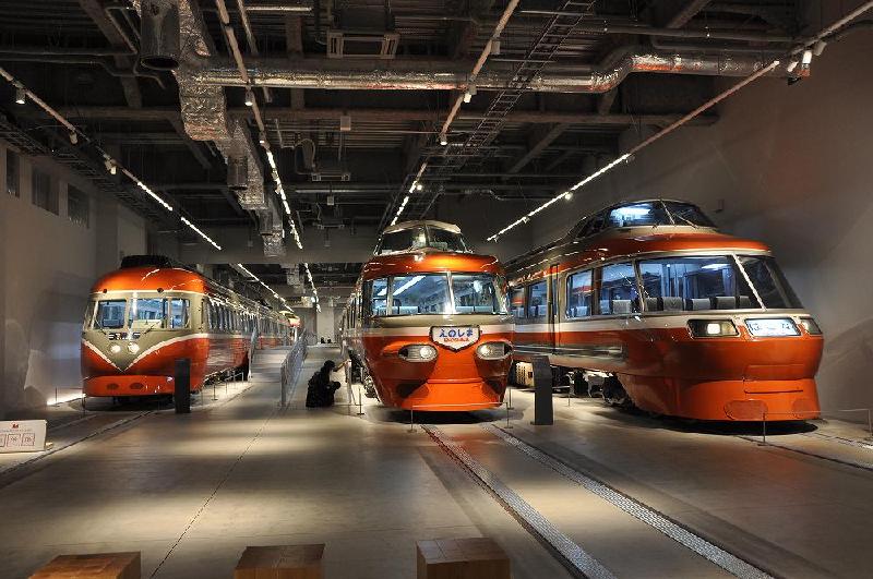 引退したロマンスカー5車種・10両が並ぶ圧巻のスペースである。 検車庫のようなインダストリアルでシンプルなデザインにすることで、車両の美しさが際立つ空間になっている。