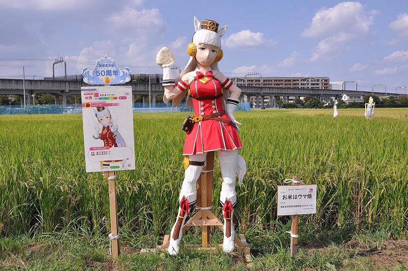 ゴールドシップのかかしは、右手にはおにぎりを携え、不敵な笑みを浮かべ田んぼに佇んでいる。