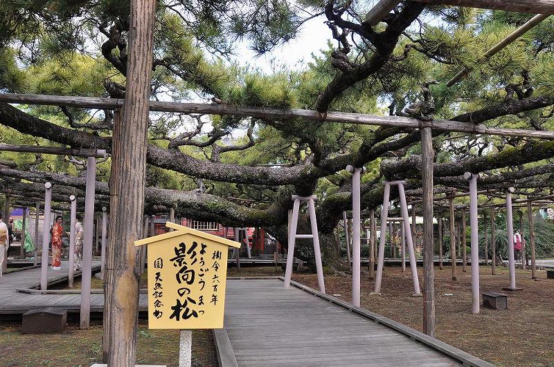松の高さは約8メートルですが、その枝ぶりは広く、樹周4.5メートル、東西約31メートル、南北約28メートル、日本一の繁茂面積である。 |