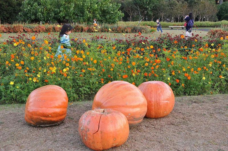 今年は、10月12日から10月31日にかけて、正面広場にプラスチックで平面的なかぼちゃのモニメント、芝生広場では大きなオバケカボチャを置いて、温室にはカボチャのオバケが飾られていました。