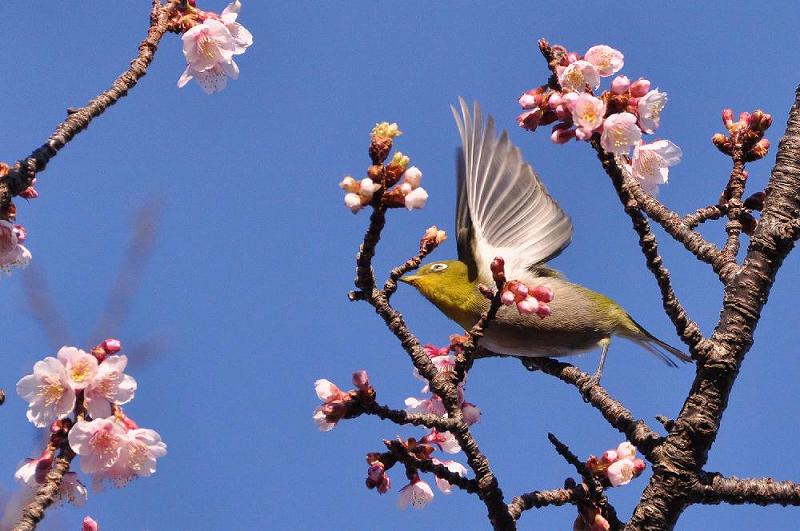 今年発表のあたみ桜は四季の道で93本といっているが、ほとんどが若い木であり、15本くらいが見ごたえのある「あたみ桜」で、100羽ほどのメジロが集まっている。