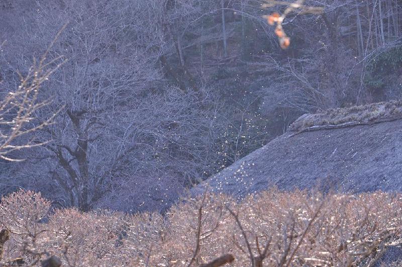 「望遠レンズの18-400mm」で40〜50メートルほど離れて写真を撮っていると、梅の木の中から「蚊柱」が高さ3〜10メートルの範囲で伸びたり縮んだりしている。