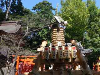 神社の境内で、神輿の台に載せ飾り付けの作業を行なってました。