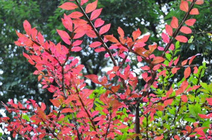 朱色の鮮やかなニシキギ、赤や黄色い葉っぱに、こげ茶色の皮を脱ぎ、純白の肌をあらわにするナンキンハゼの実。