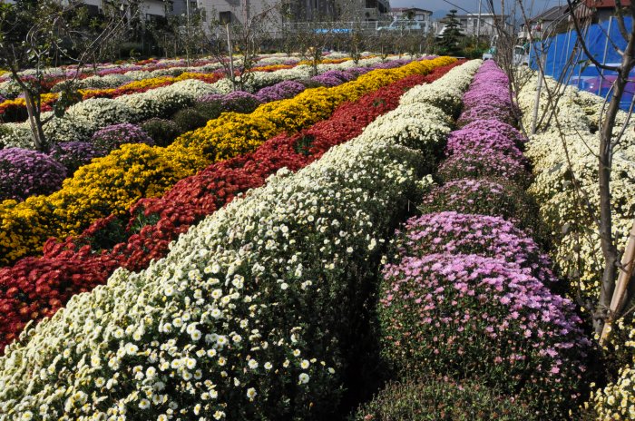 畑に近づいて見ると、色別に長い列をしたざる菊がカマボコ状に並んでいる。