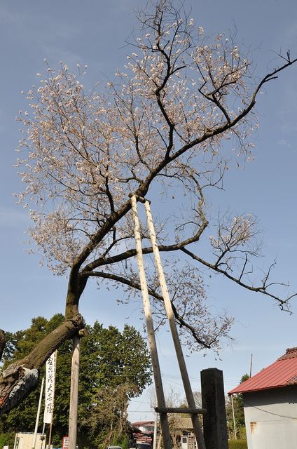 根付いて桜になったと言われている。 枝や幹が大きく折れてしまった状態で、見るも痛々しい姿でしたが、 残った枝先には満開の桜をつけていました。ちょっと感動。 |