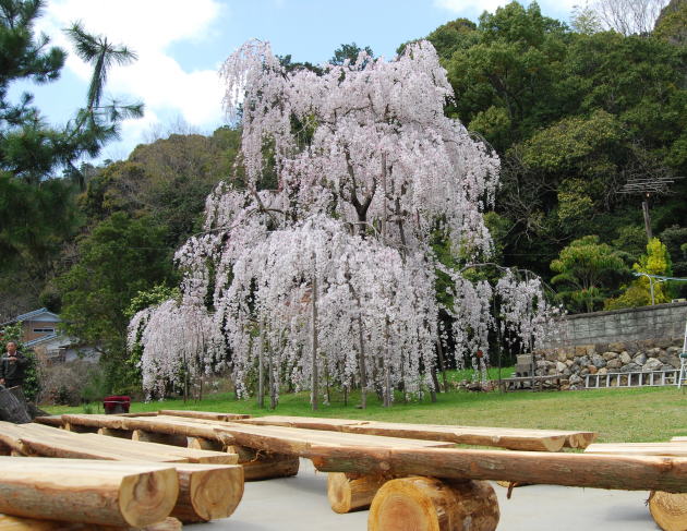 飯谷の山裾でご主人が、手入れをして大事に育てた40年余りに成る しだれ櫻です。色んな行事を行って 皆さんに櫻を見て貰っています。 腰掛も、ご主人お手製で櫻がお好きな気持ちが伝わってきます